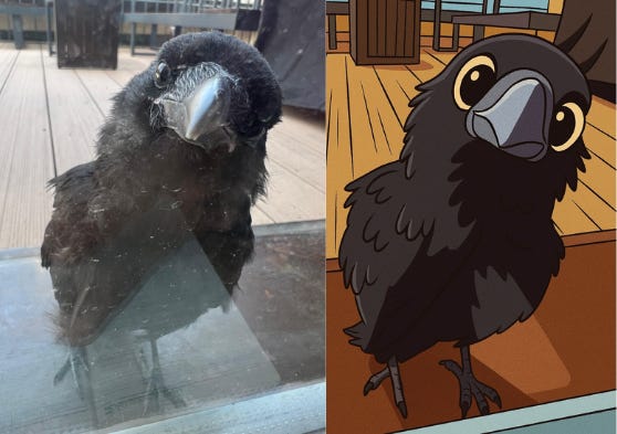 Another fun thing: I had a baby crow visiting me this week on my terrace, and I got this funny picture. Then I asked ChatGPT to transform it into a cartoon. I really love the result.
